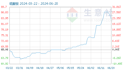 據(jù)生意社商品行情分析系統(tǒng),6月18日國內硫酸銨市場均價為1033元/噸,較6月10日國內硫酸銨市場均價961元/噸,國內硫酸銨市場價格上漲幅度為7.45%。