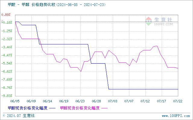 據(jù)生意社行情分析系統(tǒng)顯示,截止到7月23日甲酸企業(yè)報(bào)價(jià)均價(jià)為2678元/噸,與上月同期價(jià)格相比下跌6.02%,與7月初價(jià)格相比下跌3.53%,與上周相比價(jià)格穩(wěn)定。